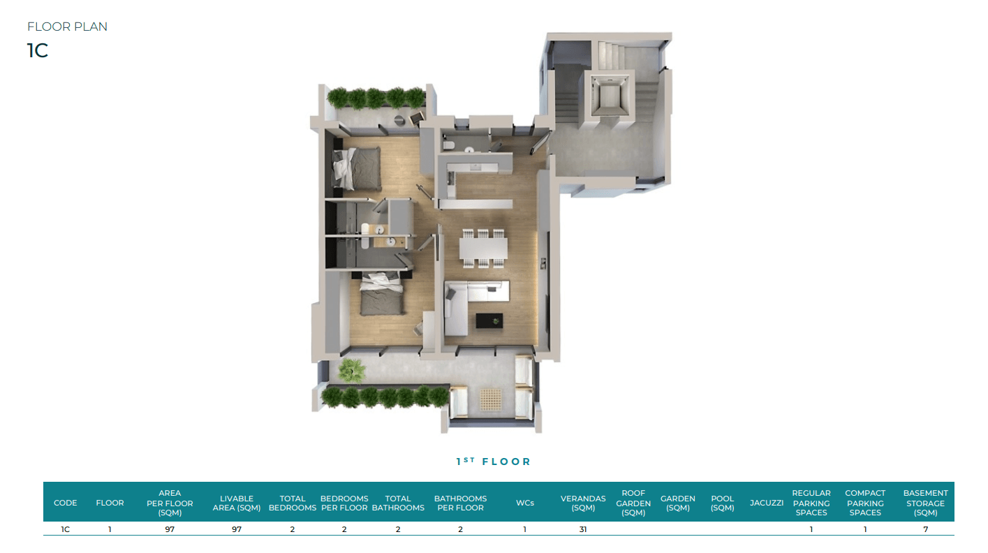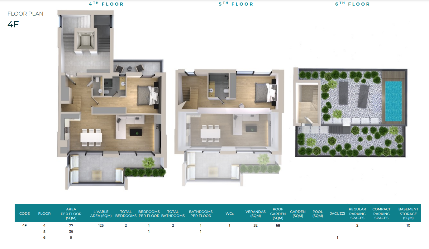 The AURA Project hosts 28 premium apartments, from 75 up to 170 square meters of living areas  of which four 4bd maisonettes with private gardens and pools, 6 penthouses with private roof gardens and Jacuzzis and 18 deluxe apartments. All the residences come along with a common use gym, parking spaces and storage rooms.